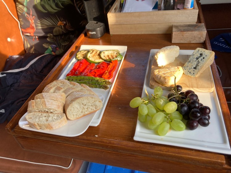 Uitgebreide plank met een soepje, diverse kaasjes, vleeswaren, gegrilde groente en fruit.